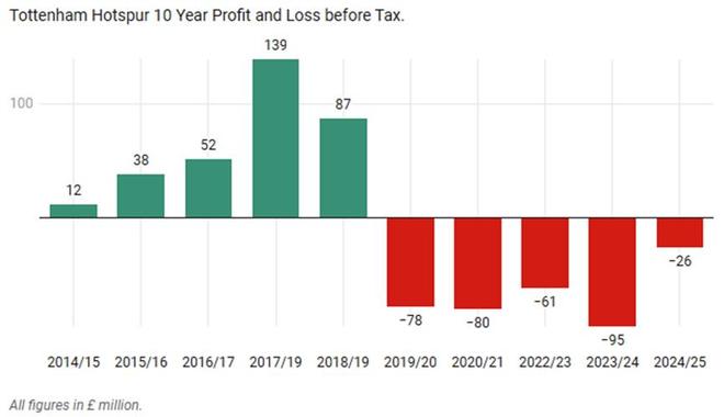 熱刺2025年最新發佈的財報顯示,在2023-2024賽季,球隊凈債務(債務-現金及等價物=凈債務)從7.7億歐元(63.49億人民幣)擴張到瞭8.8億(72.40億人民幣)歐元。營收方面,熱刺連續兩個賽季均錄得凈虧損,總計達1.25億歐元(10.31億人民幣)。
